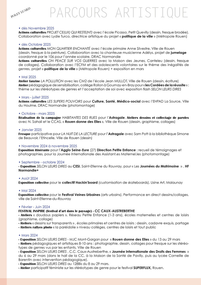 Je ne montre ici qu'un aperçu des ateliers. Le dossier peut être envoyé par mail sur demande : poleyluard@gmail.com.
